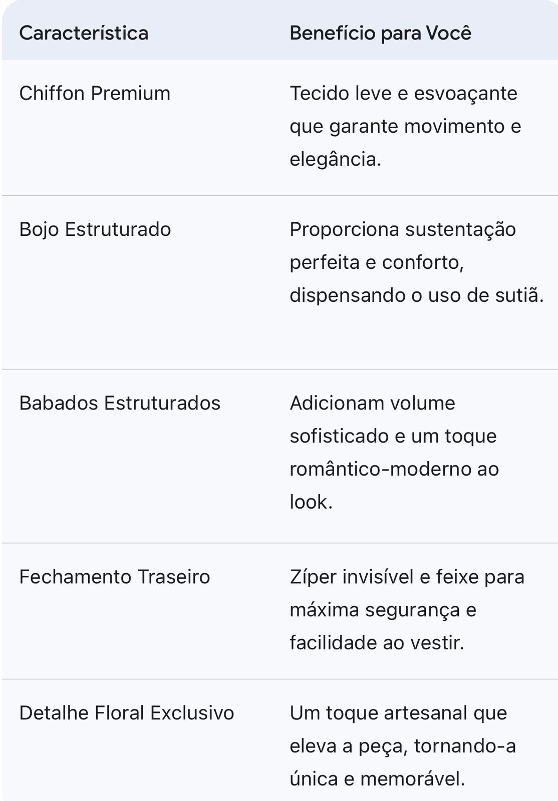 Prepare-se para brilhar! Nosso Vestido Tomara que Caia é a definição de sofisticação moderna. Confeccionado no luxuoso Chiffon, ele oferece um caimento leve e fluído, ideal para casamentos, formaturas e eventos de gala. Sinta-se segura e deslumbrante a noite toda!