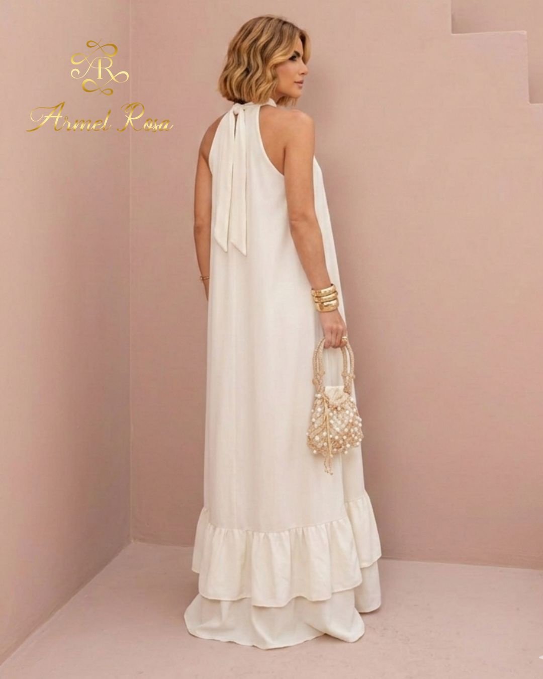 Saia Maxi com Movimento: A base do vestido conta com um barrado em camadas (estilo ruffle), que proporciona volume e um movimento gracioso a cada passo.